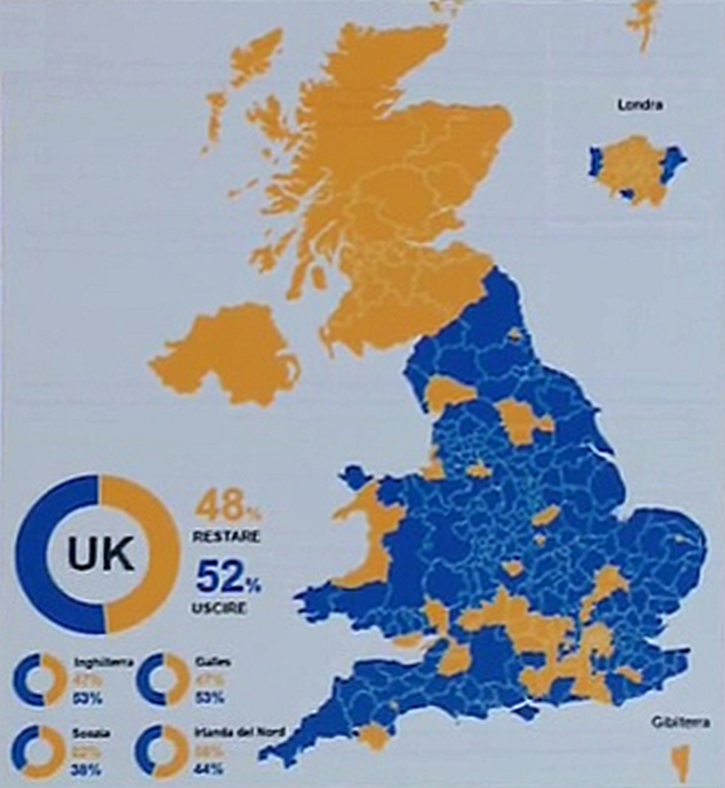 Con una percentuale minima di votanti sugli aventi diritto (nell'ordine del 30%), il 48% ha votato remain (restare), il 52% leave (uscire).